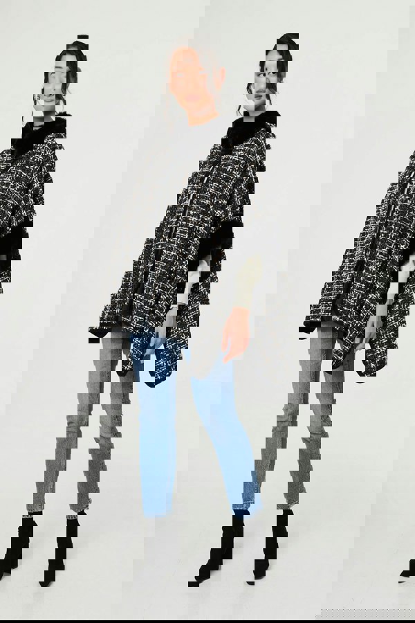 This elegant poncho is the perfect extra layer for any smart evening outfit. It has an oversized shape with a longline fit, 3/4 sleeves and an open front. Fasten the buckle at the neckline and stay cosy thanks to faux fur trims. This poncho layers beautifully over trousers, dresses and skirts.