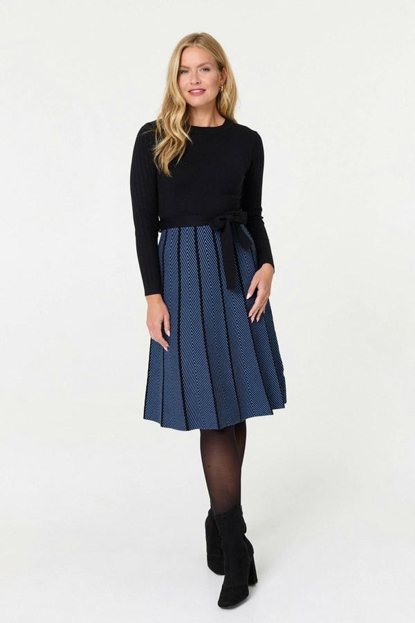 This cosy knit dress is made from a comfortable jumper material for extra warmth. It has long sleeves, a removable tie waist belt and a pleated texture. Thanks to a flattering skater shape, this dress will suit all figures.