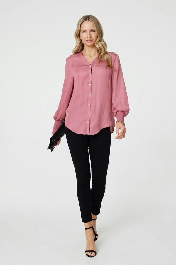 This comfortable shirt is your new favourite for work or formal events. It's made from a sleek satin material, with a flattering v-neck and buttons down the front. The long sleeves have shirred cuffs for an elegant silhouette - so all you need is a pair of black jeans to create the perfect smart-casual outfit. Complete the look with either heels or boots, depending on the season and dress code.