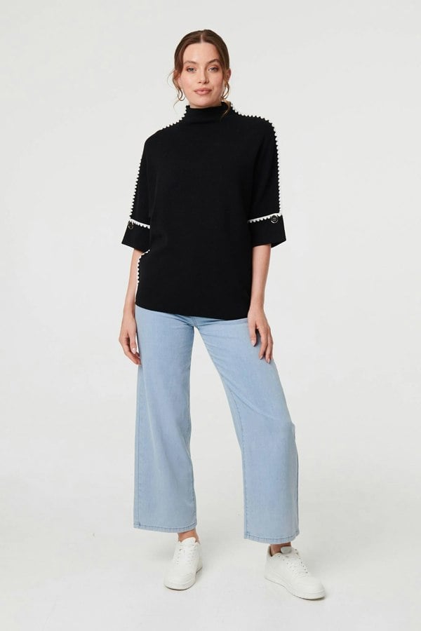 Add this unique top to your wardrobe this season for a stylish, smart look. It has 3/4 sleeves and a high neck, with a contrast trim around the edges for an eye-catching finishing touch. The boxy shape and hip length hem layer elegantly over any trousers or skirt for a smart finish.