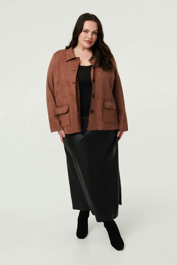 Elevate your layering options with this Izabel London curve faux suede jacket, designed to combine contemporary style with everyday versatility. Crafted in a rich brown tone with a soft-touch faux suede finish, this shirt-style jacket adds texture and warmth without feeling bulky.