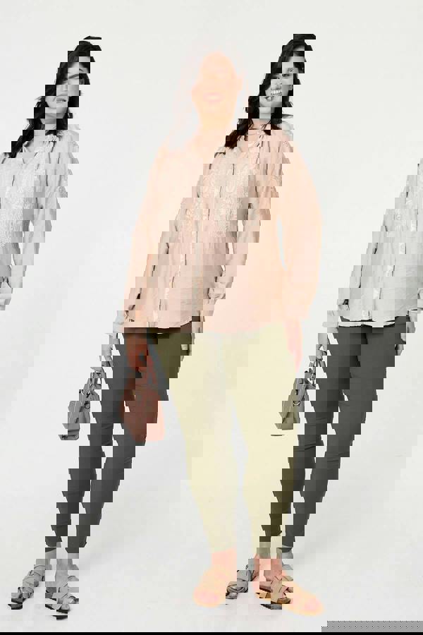 This elegant top is finished with beautiful embroidered details and lace trims. It has long sleeves and a relaxed fit for a laid-back look, but can be styled with a smart midi skirt for a professional or evening-ready outfit. It also has a v-neck, buttons and a hip length hem.