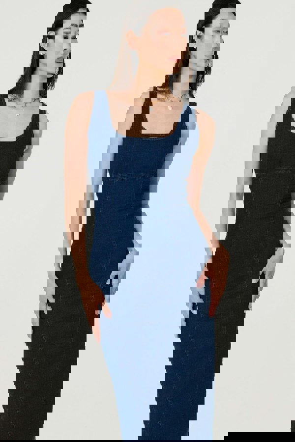 Make a stylish statement in this elegant denim midi dress. With a square neckline, wide cami straps, curve enhancing contoured front seams, a zip back, a split back detail and a raw hem sitting below the knee. Elevate with metallic heels for a dinner date with the girls or dress down with strappy sandals and a cross body bag during the day.