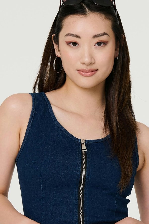 Add an on-trend essential to your closet with this sleeveless denim dress. With a round neck, wide cami straps, a fill zip front, a fitted silhouette and a knee length skirt. Style with flat sandals and sunnies for a chic dressed down daytime look or elevate with heels for evening drinks.