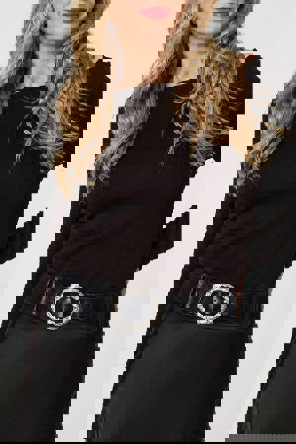 This statement belt features beautiful sparkly diamante details around the buckle, as well as faux leather materials. Thanks to a wide shape, you can wear this belt around your waist over a jumper or a dress for a statement evening look.