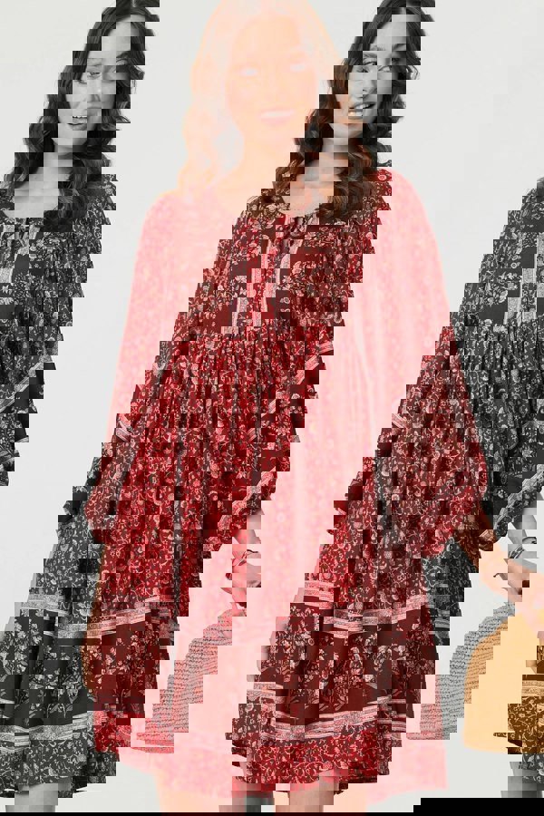 Keep casual in this elegant dress. It has 3/4 puff sleeves and a tassel tie front, as well as a stylish keyhole neckline detail. The shape is relaxed and comfortable, with a ruched front and a short length hem. Wear this dress with tights and boots on a chilly day, or simply style with your favourite sandals to see this dress through every season.