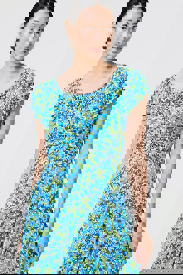Stay cool and fashionable in this midi dress. It's made from 100% viscose for a comfortable fit; with a flattering Bardot neckline and short puff sleeves. It also has a tie waist, shirred details and pockets. Wear this dress with sandals on a sunny day out, or elevate it with heels and a clutch bag for formal evening plans.
