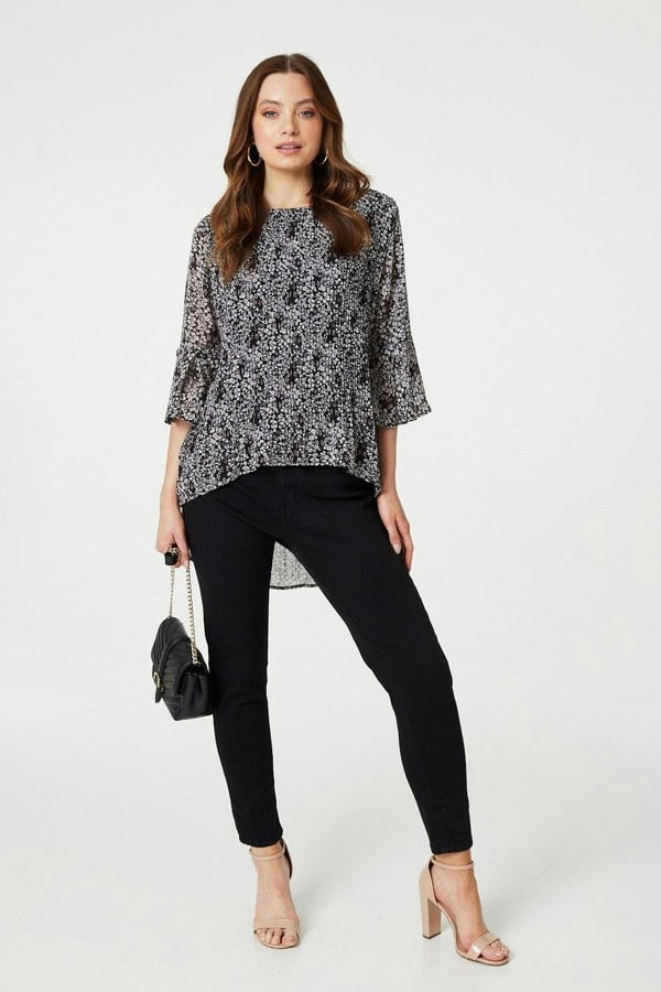 This beautiful pleated blouse is perfect for days at work, smart daytime plans or even a formal evening at a wedding. It has 3/4 flared sleeves, a round neck and a curve hem. The semi sheer fabric is pleated to create a stylish drape that will flatter your figure.
