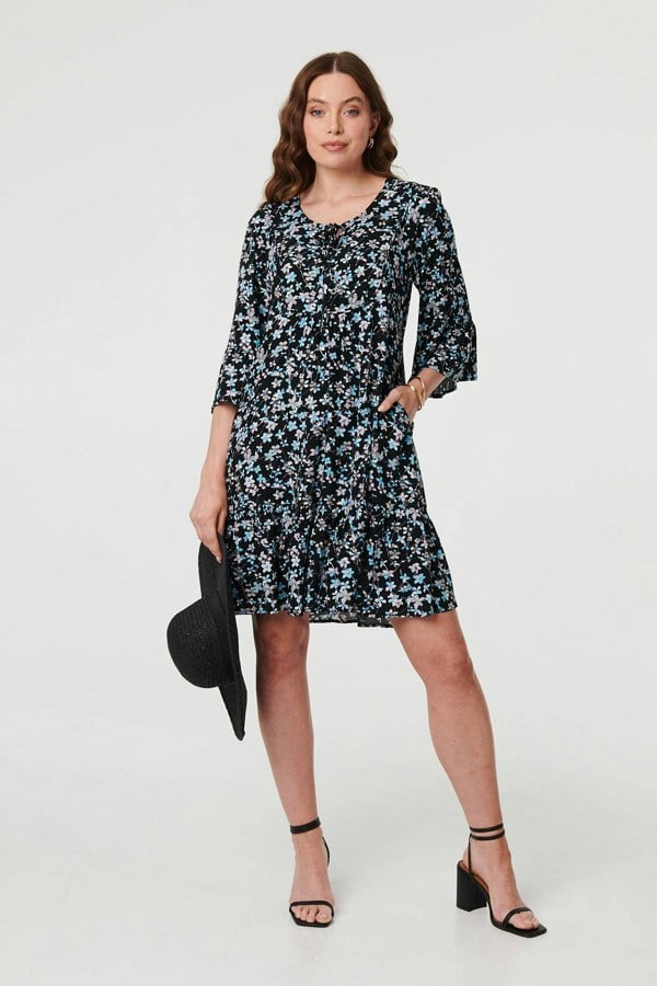 This comfortable dress has a relaxed fit that will flatter every body type. It has a scoop neck, a row of buttons and 3/4 sleeves. It also has a tie front detail and handy pockets. Wear it with tights and boots for an effortlessly stylish workwear outfit.