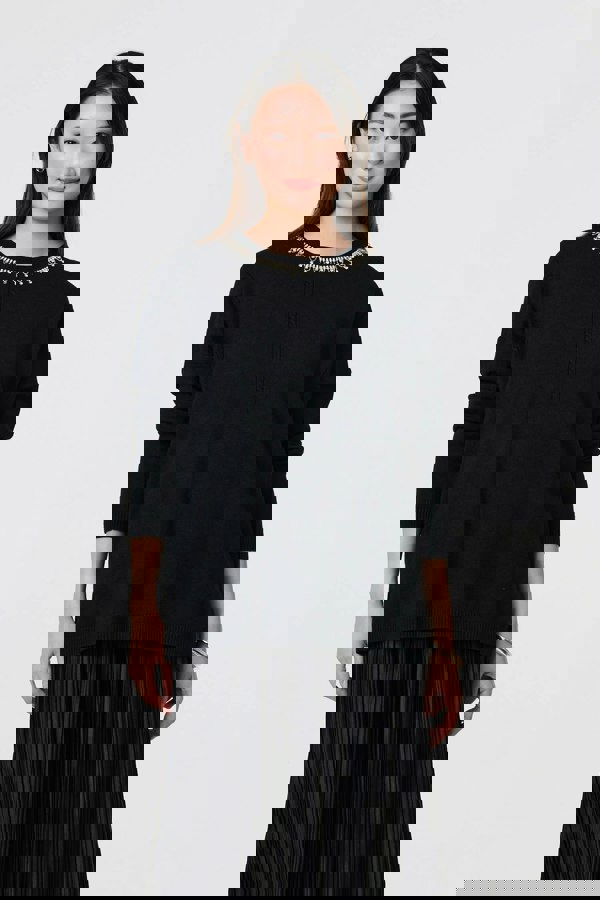 This jumper features a subtle embellishment around the neckline that will add a touch of sparkle to your look. It has a relaxed oversized fit, with long sleeves and drop shoulders. It's also made from a viscose blend so you'll stay comfortable all day. Wear over a dress or layer up with jeans or trousers.
