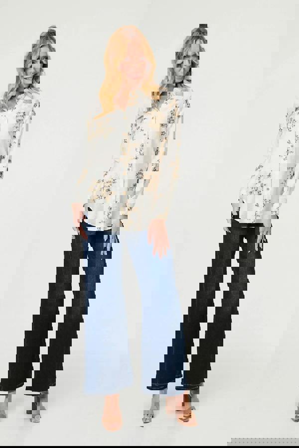 Every wardrobe needs an elegant long sleeve shirt. This one has a classic collared v-neck, front buttons and a relaxed shape. It features a thigh length curved hem and looks stylish paired with your favourite blue jeans.