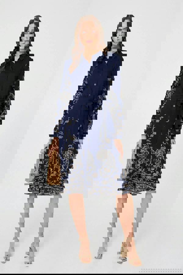 This elegant midi dress is perfect for smart days at work and evenings out. It has a flattering tie waist, front buttons and long sleeves. The embroidered details add a beautiful trim around the hem and the sleeves. Wear this dress with tights and boots, or smart black heels for an evening out.