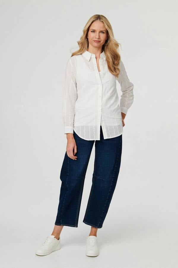 This simple-yet-stylish shirt is a must for every spring wardrobe. It has a classic collar and buttons, long sleeves, and a relaxed fit. The material is finished with a beautiful embroidered detail, and it has a thigh length hem ready to be tucked into your waistband or layered over it.