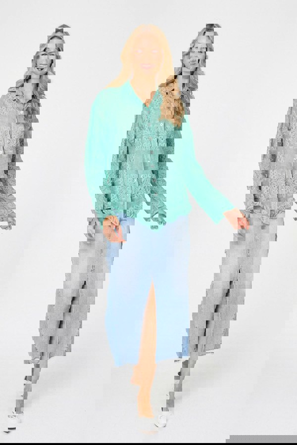 Dress for work or smart occasions with this simple shirt. It has long sleeves, a collar and a row of buttons down the front. It also has a frilled hem and embroidered textures. Dress it up with smart trousers, or keep it laid-back with blue jeans.