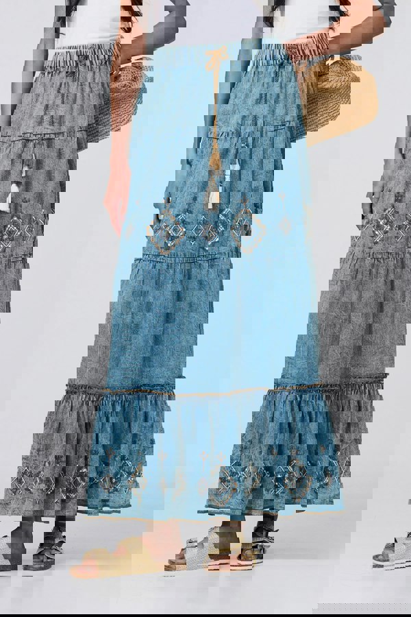 All wardrobes need a stylish high waist skirt just like this one! It has an elasticated waistband with a tassel tie drawstring, as well as a flattering tiered shape. The denim material is made from super-soft 100% cotton fabric, complete with intricate embroidered details. Use this skirt to add a bohemian-inspired touch to any outfit.