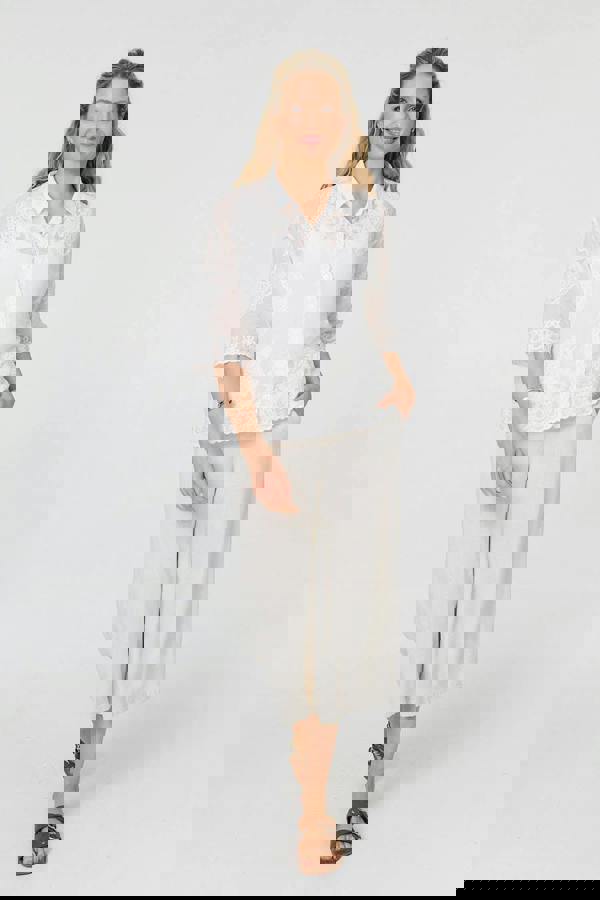 Dress for summer in style wearing this relaxed shirt. It has 3/4 sleeves, a collar and front buttons. It's finished with an embroidered lace trim and has a relaxed fit. Wear it with smart faux leather textures, or keep it casual with blue jeans for a relaxed look.