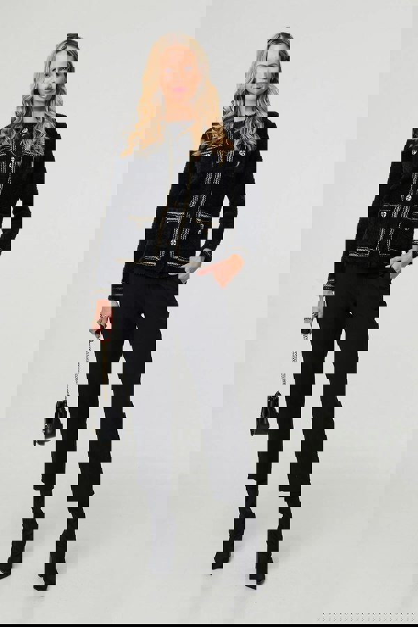 This smart jacket features elegant embroidered trim detailing and decorative button fastenings, complemented by long sleeves and a hip-length hem for a flattering, structured silhouette. Crafted from a comfortable knitted fabric, it layers perfectly over blouses or dresses and pairs beautifully with tailored trousers or skirts for weddings, events and formal gatherings.