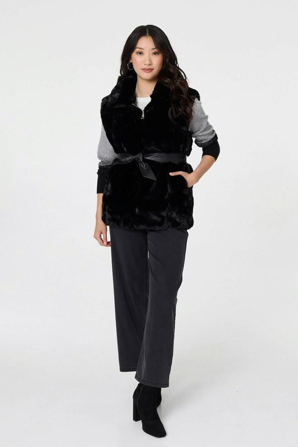 Add an extra layer to your outfit with this super-soft faux fur gilet. It has a sleeveless fit, with a wide collar and a zip on the front. Fasten the tie around the waist for the perfect fit and keep your hands toasty in the pockets. This gilet is perfect for casual and more formal dress codes.