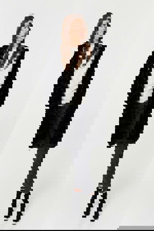 Crafted from plush padded faux fur, it features a cosy hood for added warmth, along with a popper-fastened front for easy layering. The thigh-length hem offers flattering coverage, while handy front pockets keep your hands warm and essentials close. Wear it over everyday outfits or dress it up for chilly evenings out.