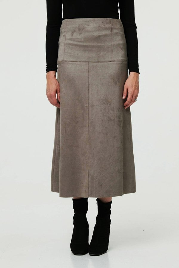 Bring effortless elegance to your everyday wardrobe with this faux suede midi skirt. Designed with a flattering high waist and a classic A-line silhouette, it creates a streamlined shape that works perfectly for work, weekends and beyond. The soft faux suede fabric adds a refined finish, while the midi length hem makes it easy to style with trainers for a relaxed look, or heels and boots for a more polished outfit.