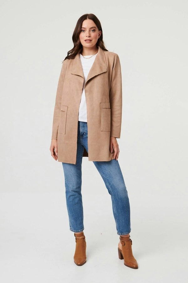 This soft jacket is perfect for staying warm and looking glamorous. It's made from a comfortable faux suede material and has a relaxed, open front fit. The wide collar and thigh length fit flatter all figures, and it even has handy pockets on the front. It also has long sleeves and can be layered over a thick jumper for extra warmth.