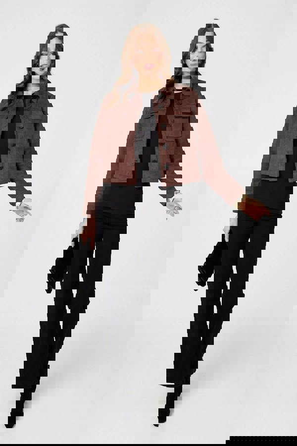 This smart jacket is made from soft faux suede materials. It has a boxy cropped shape that layers perfectly over any smart or casual outfit. It features statement buttons, pockets and long sleeves.