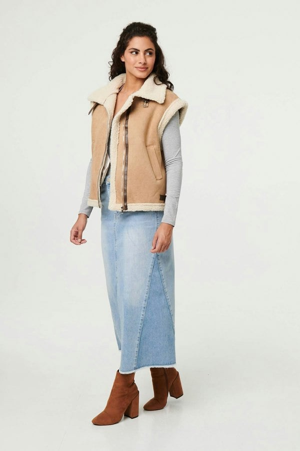 Add an extra layer with this beautifully soft gilet. It's made from a suedette texture material and has a cosy faux fur lining inside. It also has a zip front, buckle details and a wide collar. Wear it with a relaxed or formal outfit for instant style and warmth.