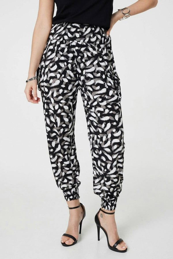Stand out from the crowd in these fun feather printed harem trousers. With a high waist, a stretchy smocked waistband, pockets, a tapered fit and soft smocked ankle cuffs. Style with a t-shirt and heels for a stylish holiday dinner look or pair with a relaxed t-shirt and trainers for a casual daytime look.