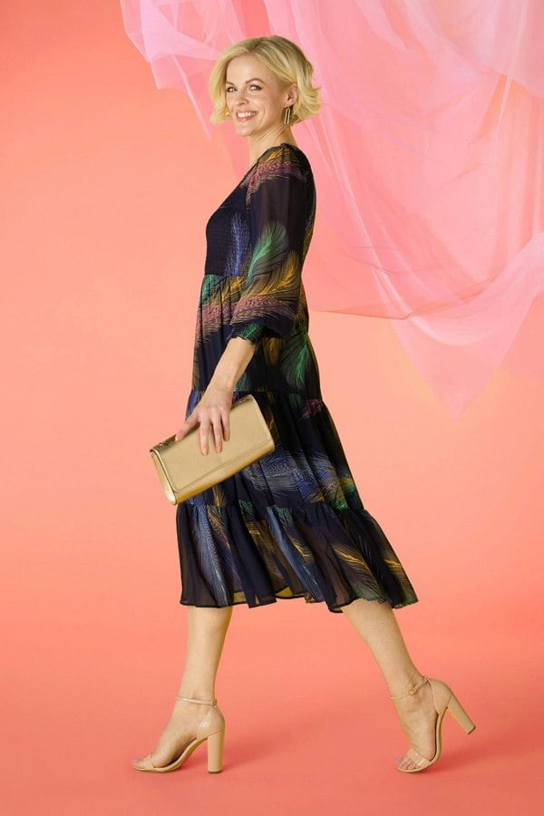 Turn heads in this vibrant feather print smock dress. It has a round neck, with a smocked bodice, long puff sleeves with shirred cuffs and a tiered midi length hem. Pair with neutral heels for a standout style you could wear for both daytime and evening.