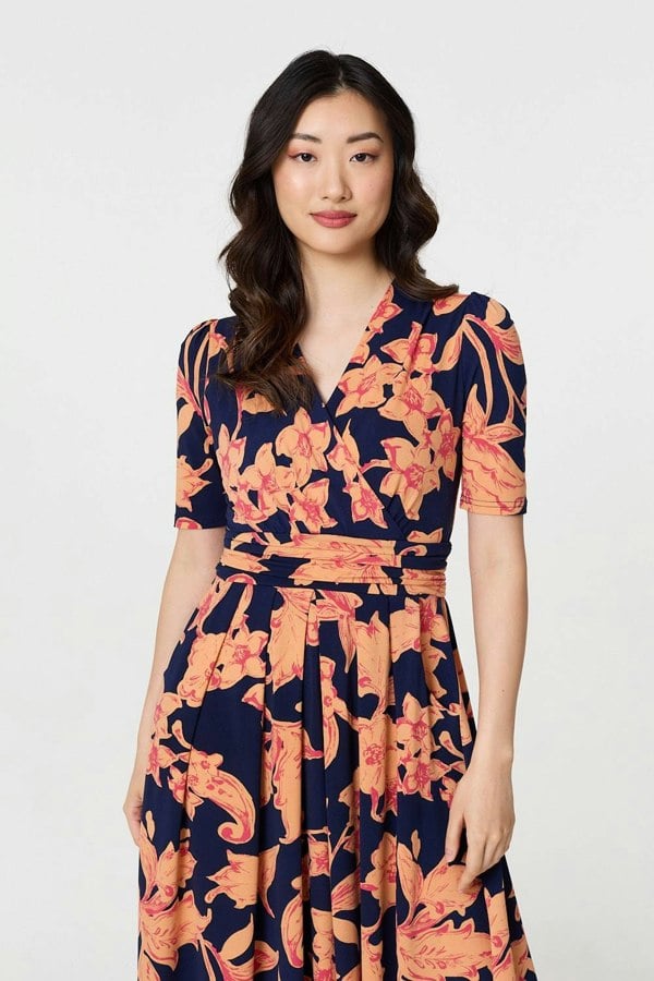 Designed to flatter from every angle, this floral faux wrap midi dress is a timeless choice for formal, professional and occasion wear. The cleverly constructed wrap-style front is paired with a ruched waistband and soft pleating to enhance your shape and create a tummy-flattering silhouette. Finished with elegant 1/2 sleeves, a feminine v-neckline and a flowing midi-length hem, this dress moves beautifully while offering all-day comfort. Style with heels for weddings, work events or polished evening plans.