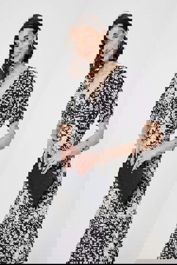 Get your look summer-ready with this v-neck dress. It's made from soft viscose materials and has a flattering wrap front that fastens with a tie at the waist. Complete with 1/2 puff sleeves, a v-neck and a split hem; this dress is perfect for pairing with heels for your next wedding or other special event.