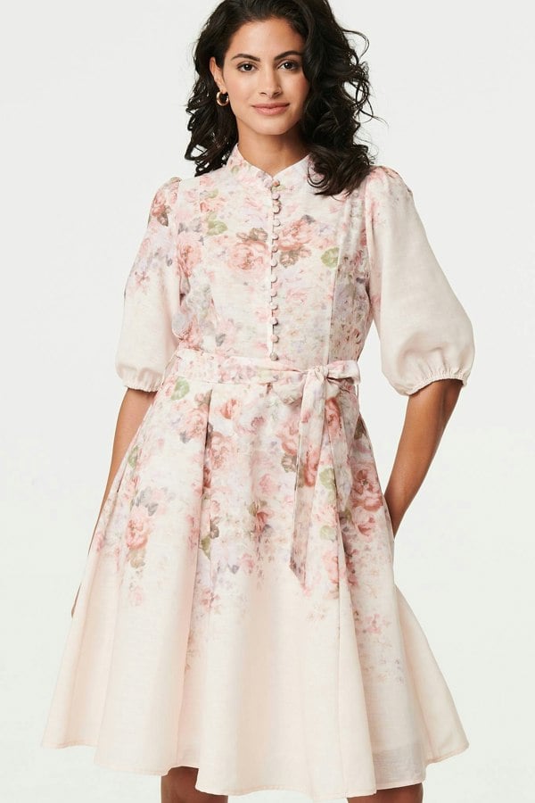 The high neckline adds a refined finish, while the 3/4 length puff sleeves bring soft volume and modern charm. A tie waist allows you to define your silhouette, and the button-front detailing adds a polished, tailored touch. Perfect for weddings, celebrations or formal daytime events, this versatile dress pairs effortlessly with heels and a clutch.