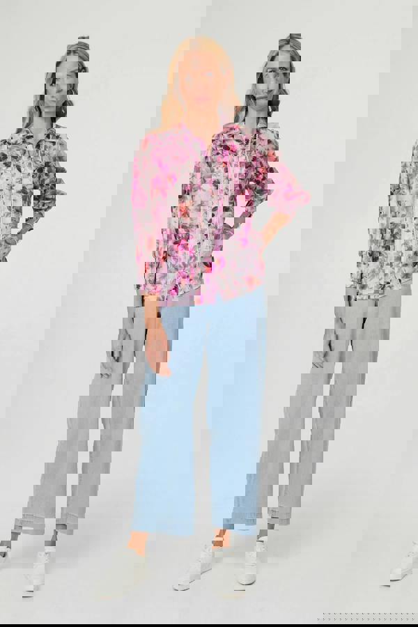 This comfortable blouse is perfect for smart occasions. It has a flattering relaxed fit, with 3/4 puff sleeves and a collared v-neck. The beautiful lace trim and button front details add a beautiful finishing touch.