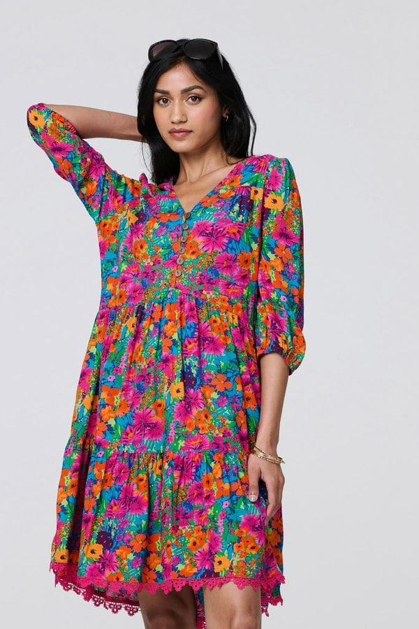 Add a breezy floral tunic to your closet for an effortless daytime essential. With a v-neck, 1/2 button front. 3/4 sleeves, a tiered skirt and a delicate lace detail hem sitting at the knee. Style with flat sandals and sunnies for an effortless daytime look.