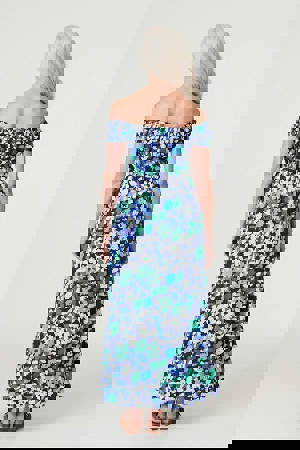 Get sunshine-ready wearing this fresh summer dress. It has a Bardot neckline, smocked bodice, side split and maxi length hem. Make the most of that beautiful off-shoulder neckline by accessorising with your favourite statement necklace.