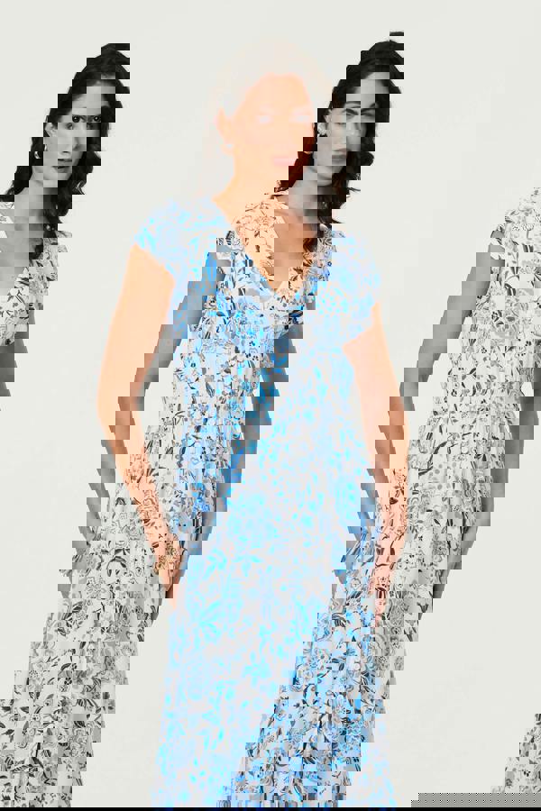 Izabel London Floral Border Cap Sleeve Maxi Dress brings a considered finish to warm-weather dressing. Cut with a maxi-length hem, it is detailed with lace trim for a refined edge. A shirred waist shapes the silhouette, while cap sleeves keep the look light and easy to wear.