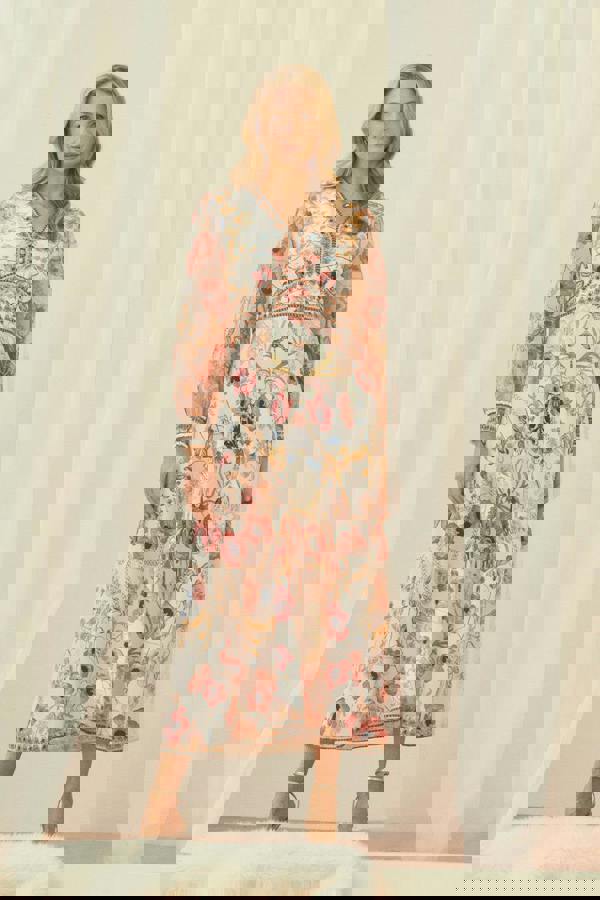 This flattering midi dress is perfect for your next party, wedding or other special occasion. It has long sleeves, a v-neck and an a-line shape. The semi sheer layer gives this beautiful dress a floaty shape that will flatter every figure.