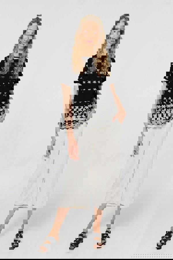 Bring a decorative finish to everyday dressing with the Izabel London Floral Embroidered Short Sleeve Top. Cut in a relaxed, boxy shape, it sits at hip length and works neatly for both work and weekend wear. A round neckline and short sleeves keep the silhouette clean, while embroidered detailing adds texture and interest.