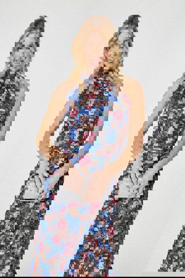For your next summer wedding, dress to impress in this beautiful halter neck dress. It has a flattering waist tie that compliments all figures, as well as a high low midi length hem with frill details.