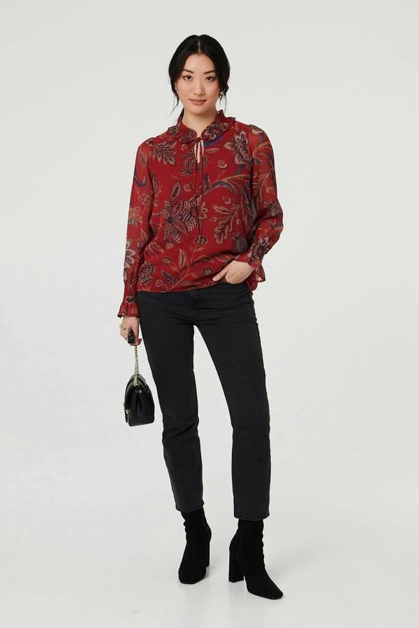 This elegant blouse is perfect for smart casual occasions. It has a beautifully relaxed shape, with a semi sheer layered texture and a curved hem. It features long puff sleeves and a high neck with a tie front detail. Wear with blue jeans or your favourite smart skirt.