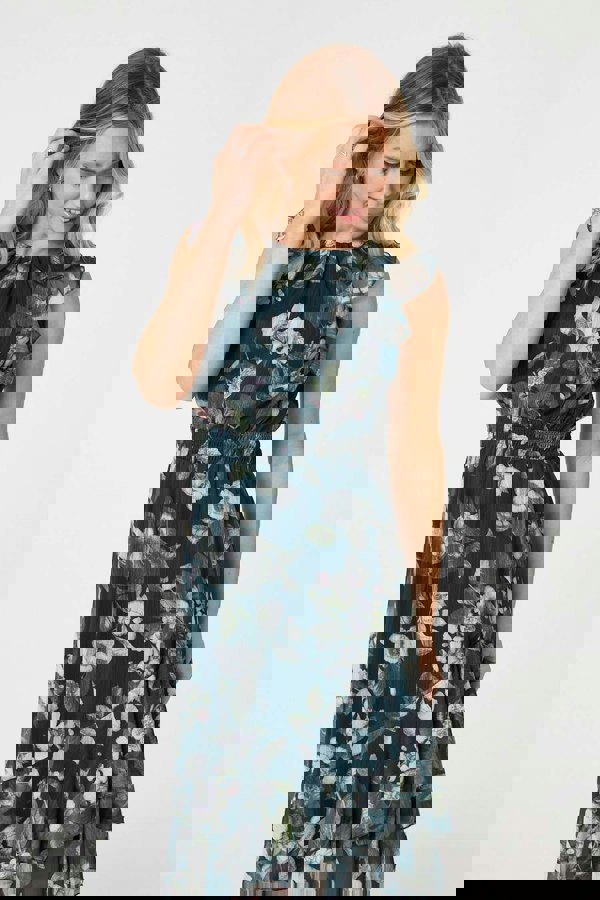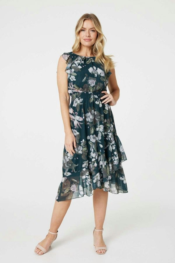 Get an elegant look with this beautiful midi dress. It has a floaty frilled skirt with a layered hem, as well as a flattering shirred waist. The high neck and cap sleeves will look classic and stylish paired with heels and metallic accessories at your next wedding or formal event.