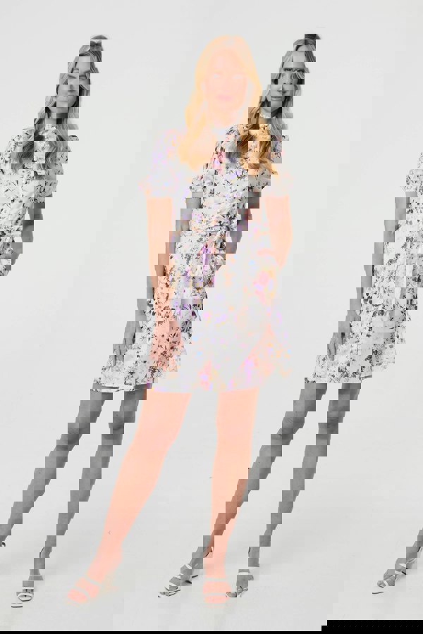 This playful short dress is ideal for special occasions, as well as dressing up for a smart-casual night out. It has short puff sleeves and a high neck, with buttons on the front and a tie waist. It even has hidden pockets to keep your items safe on the go!