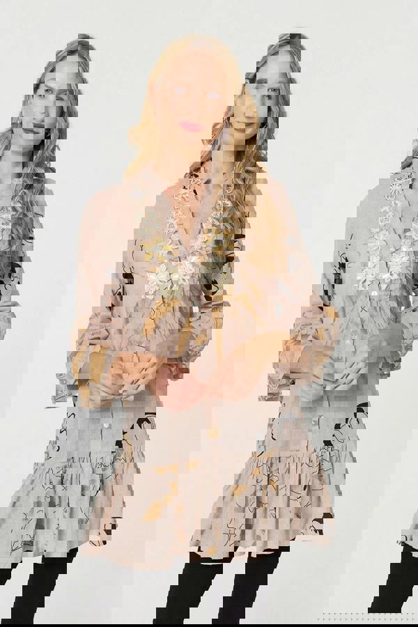 This dress is both comfortable and elegant. It has a relaxed fit with a short length shape, 3/4 frilled sleeves and tiered hem. It's finished with beautiful lace trim details and buttons down the front. Wear this dress with simple trainers and leggings.