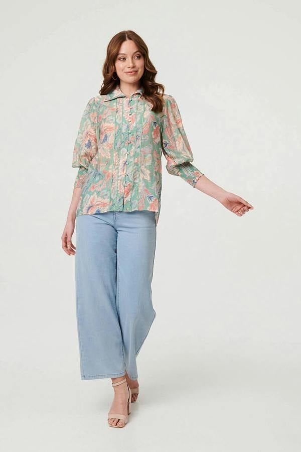 Add this elegant shirt to your wardrobe for a put-together look at every occasion. It has a beautiful classic collar, front buttons and floaty 3/4 puff sleeves. This shirt is finished with an intricate lace trim and pairs perfectly with jeans.