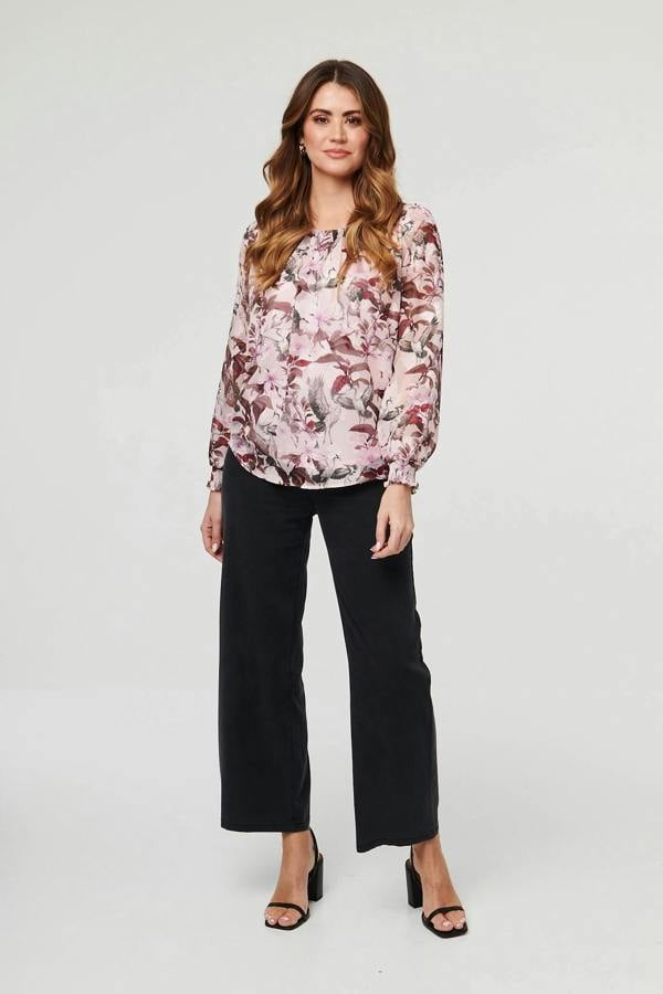 Feel feminine and elegant in this beautiful blouse. It has a ruched round neck and a relaxed fit, complete with a semi sheer layer and long puff sleeves. The thigh length hem has a curved shape that layers perfectly over jeans, leggings or smart trousers.
