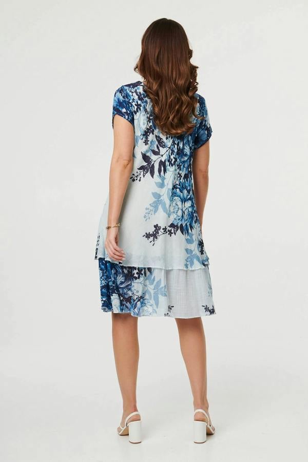 This elegant knee length dress has a layered shape, with a v-neck and a relaxed fit. Thanks to short sleeves and a loose fit, this dress is perfect for warm summer days or evenings out.