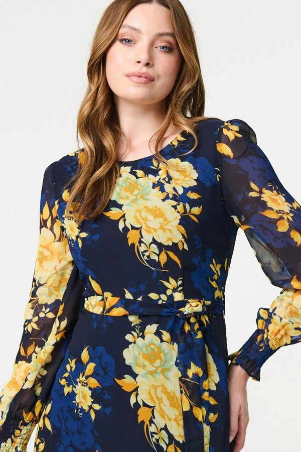 Make a stylish statement this season in this flattering floral midi dress. With a round neck, semi-sheer long sleeves, a self-tie belt, a vibrant printed chiffon overlay and an elegant a-line midi skirt. Style with metallic heels for an elegant formal event or pair with heeled boots and tights for an effortlessly refined workwear outfit.