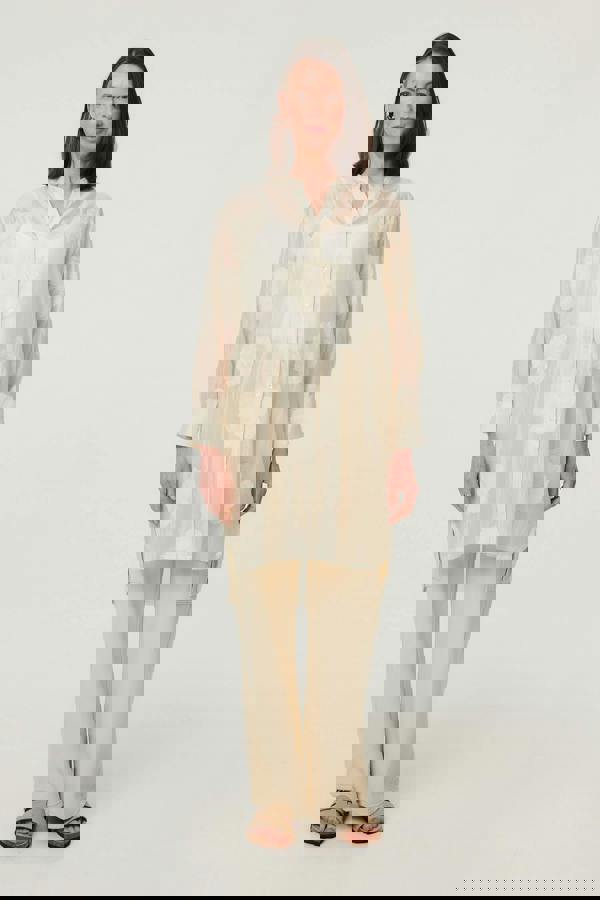 This longline shirt is an essential in every spring and summer wardrobe. It has a comfortable relaxed shape, with front buttons and a knee length hem. It also has long sleeves and a v-neck. Wear this shirt unbuttoned over a cami top and shorts, or throw it on over a swimming costume for a holiday-ready look.
