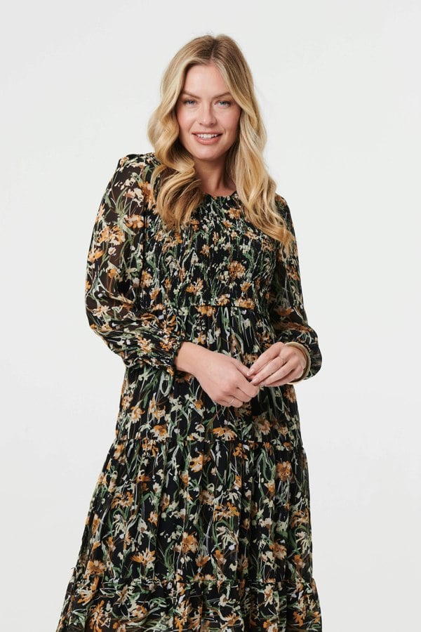 Make a statement in print with this floral midi dress. With a round neck, long sleeves, a smocked bodice and a tiered midi skirt. Style with heels for a smart daytime event.
