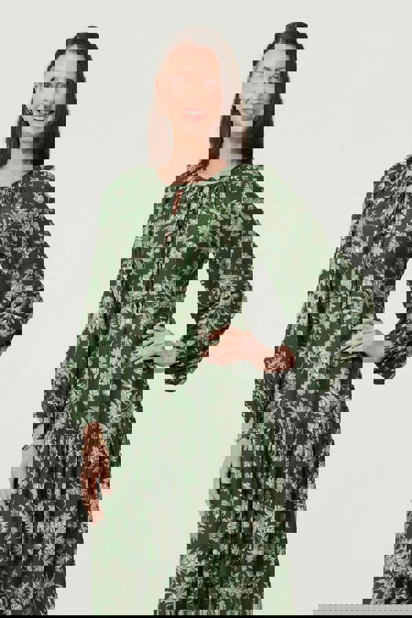 This elegant maxi dress will flatter every body type. It has long puff sleeves, a ruched tie-up neckline and a tiered shape that will float beautifully with every step you take. Wear it with ankle boots and a leather jacket.